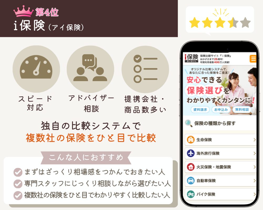 4位![]() ![]() i保険(アイ保険) | 独自の比較システム「保険料サーチ」 専門スタッフによるサポート 相談時間が限られている | 公式サイト | 最大15社 | 株式会社アイ・エフ・クリエイト | 無料 | 2分 | 即日 | 電話・メール | |||