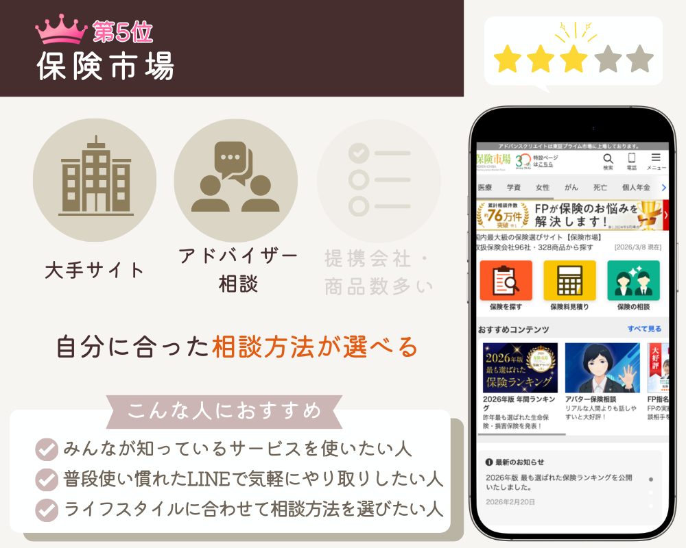 5位![]() ![]() 保険市場 | 相談手段が多い みんなが知っているサービス 提携社数が少ない | 公式サイト | 最大7社 | 株式会社アドバンスクリエイト | 無料 | 2分 | 即日 | 電話・LINE・来店・オンライン | |||