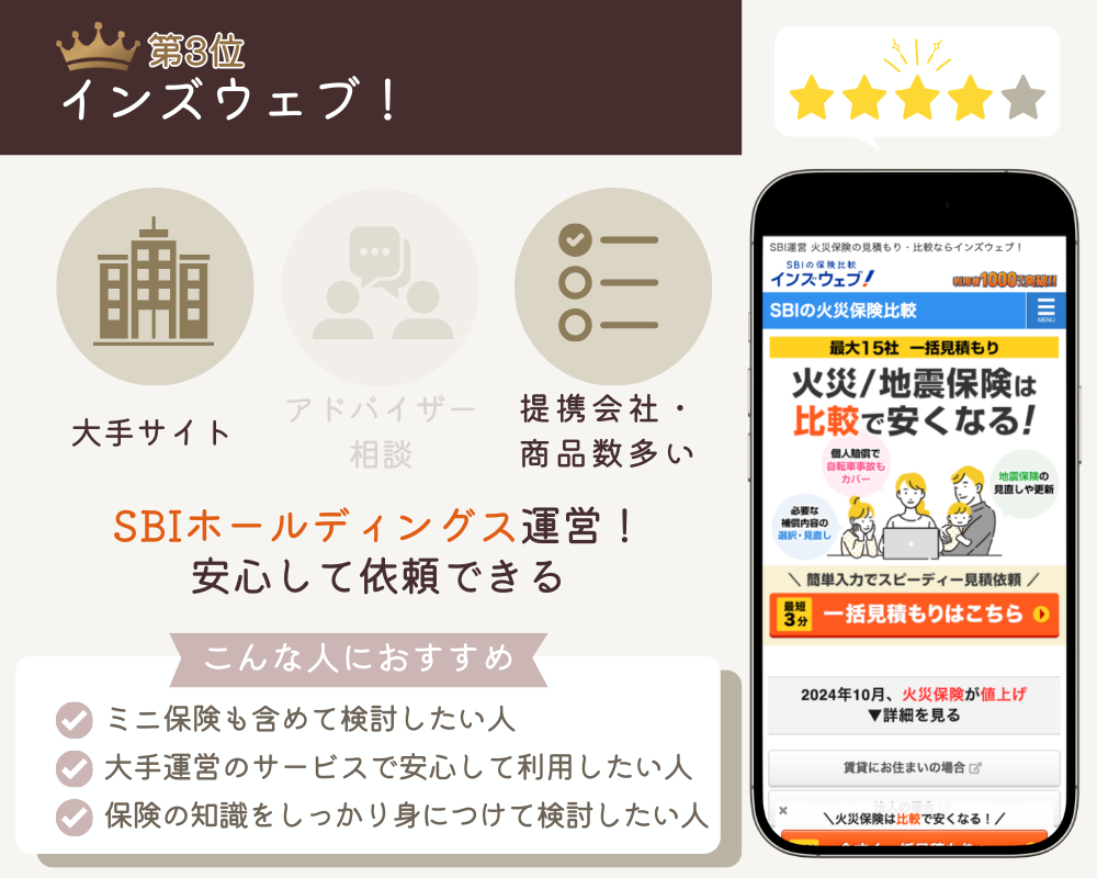 | 3位 インズウェブ | 大手サイトだから安心できる 商品ラインナップが豊富 メールの配信頻度が多い | 公式サイト | 最大15社 | SBIホールディングス | 無料 | 3分 | 1〜2週間 | 電話・メール | |||