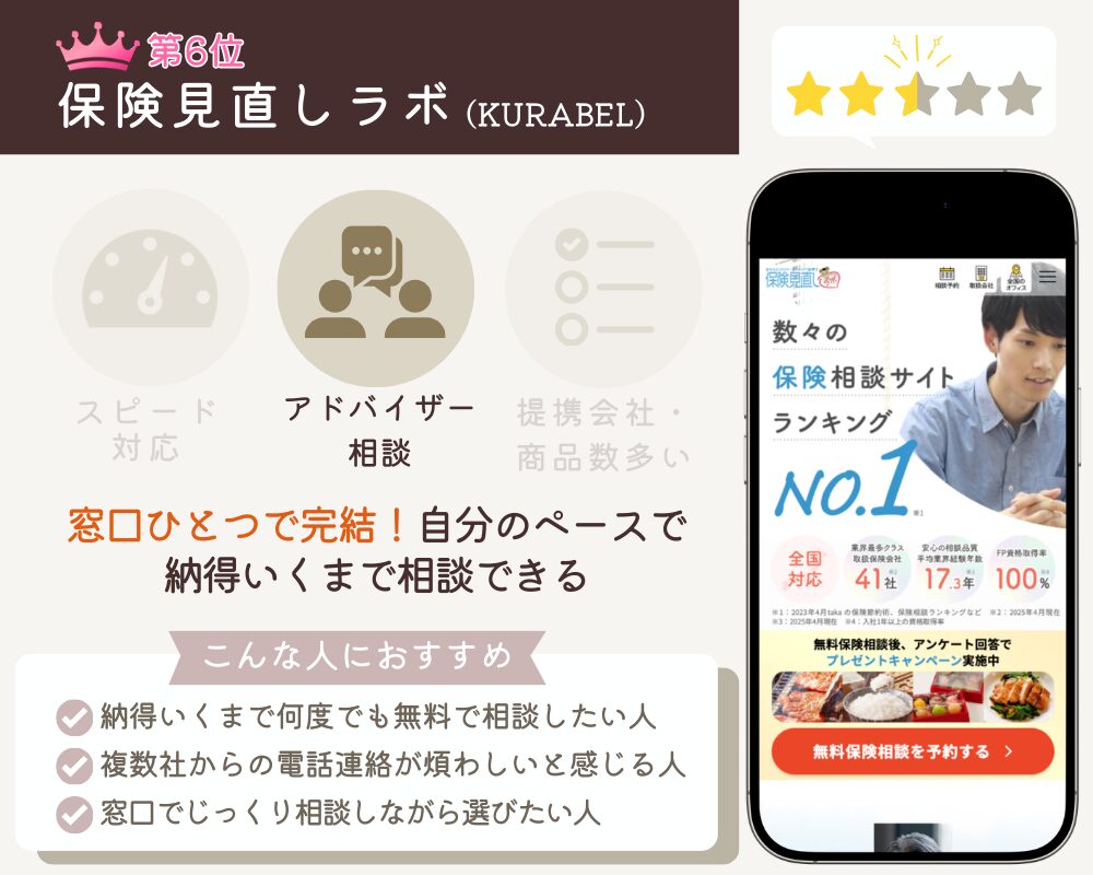 | 6位 保険見直しラボ(KURABEL) | 窓口がひとつで完結する 何度でも無料相談できる 提携社数が少ない | 公式サイト | 10社以上 | 株式会社Jリスクマネージメント | 無料 | 3分 | 不明 | 電話・メール | |||