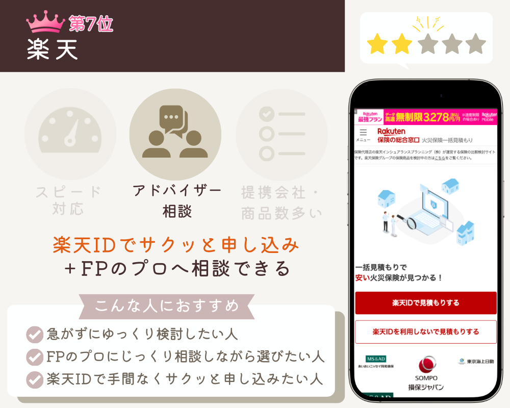 | 7位 楽天 | 楽天IDで簡単申し込み FPによるサポート 見積りに数日かかることも | 公式サイト | 最大8社 | 楽天インシュアランスプランニング株式会社 | 無料 | 不明 | 5営業日以内 | 電話・メール |