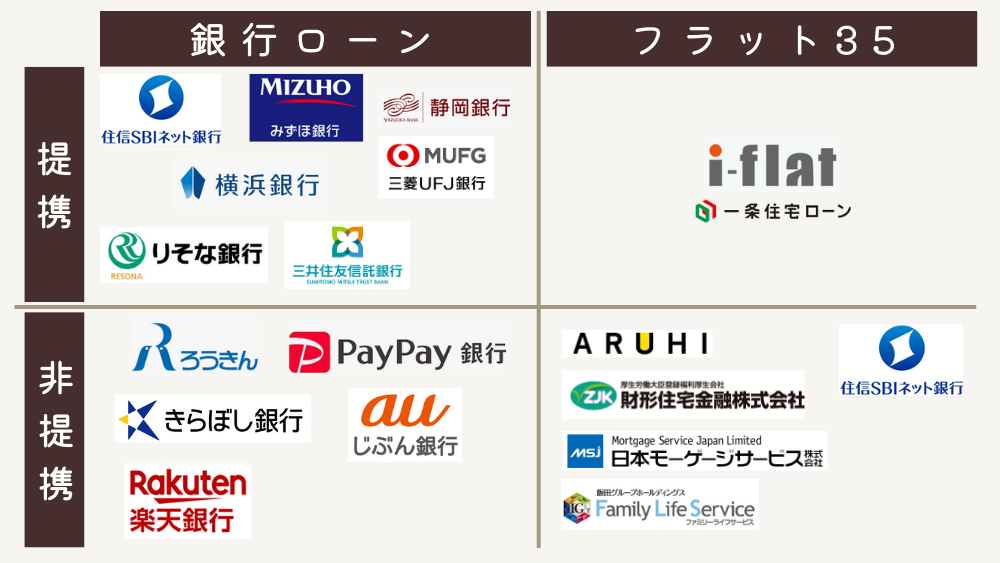 | 【提携】銀行ローン | 住信SBIネット銀行 りそな銀行 三菱UFJ銀行 みずほ銀行 三井住友信託銀行 横浜銀行 静岡銀行 |