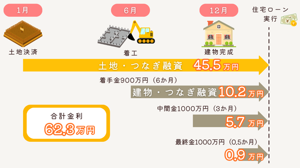 金利が住宅ローンより高めなので、なるべくつなぎ融資を使わない方が金利負担が少なくてすみます。
