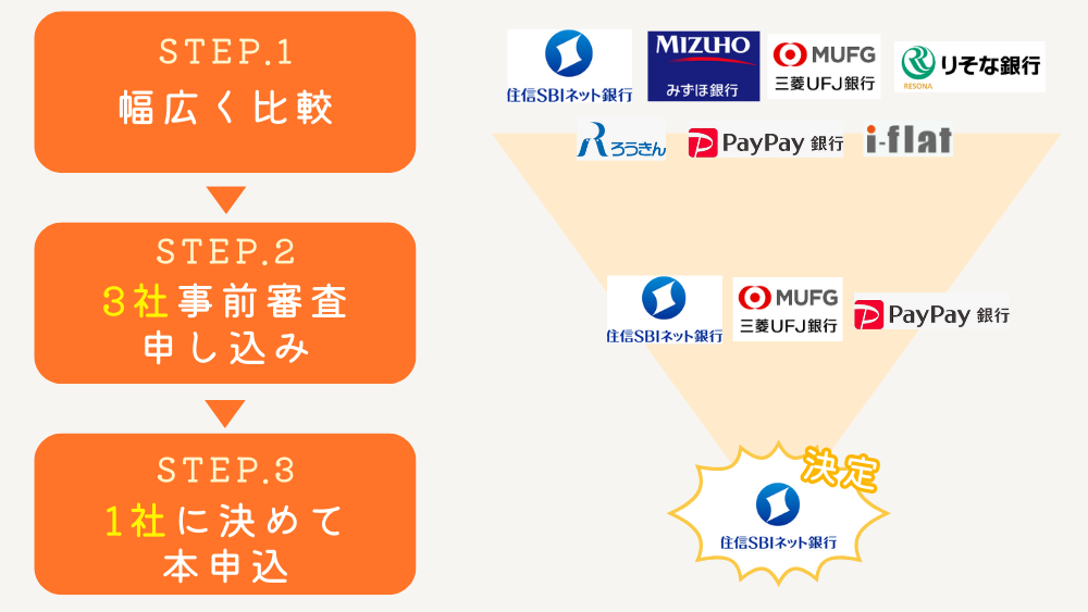 最低でも3社に事前審査を申し込むことで、自分にとって本当に有利な条件を見極めやすくなりますよ!