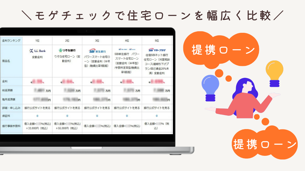 効率よく住宅ローンを選ぶには、提携ローンを紹介してもらいながら、幅広く住宅ローンを一括比較できる「モゲチェック」などのサービスを活用するのがおすすめです。