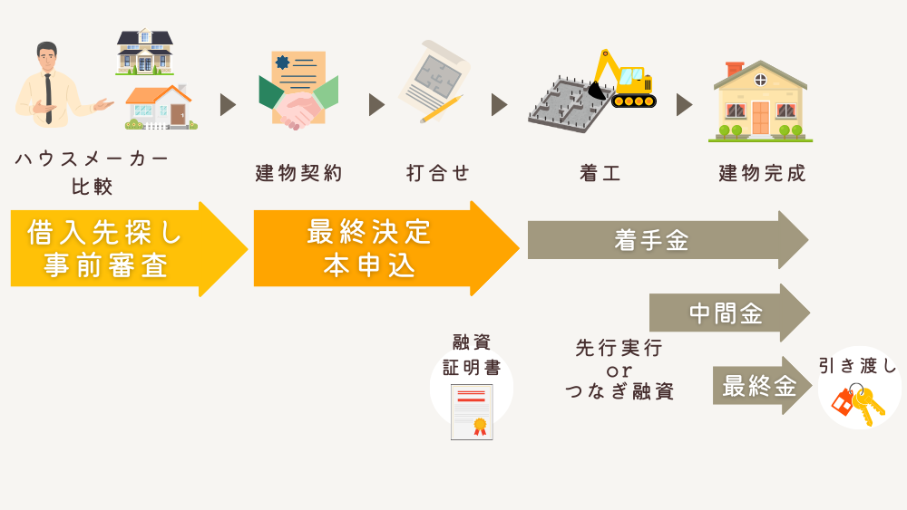 建物費用だけ借入する場合は、建物の契約をする前に事前審査を行って、借入できる金額を知っておくことが大切です。契約してから間取りの打合せが3か月ほどありますので、最終的に申し込む1社を決定し本申し込みをしておきましょう。