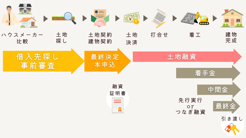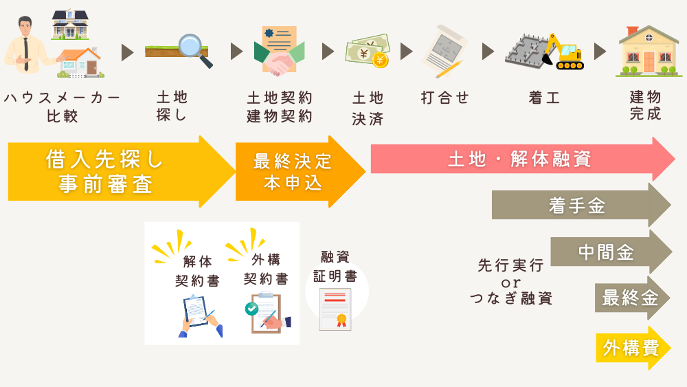 建物と土地の費用を借入する場合は、土地の決済(通常は土地契約から1か月後)までに、借入先を決めて本申し込み・実行の手続きをする必要があります。