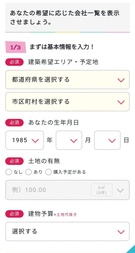 フォームの選択肢に沿って「建築希望エリア」「生年月日」「土地の有無」「建物予算」を入力してください。