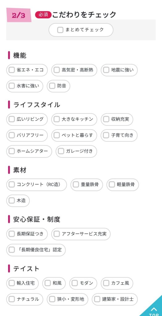 機能や素材など、理想の家づくりでこだわりたいポイントにチェックを入れます。