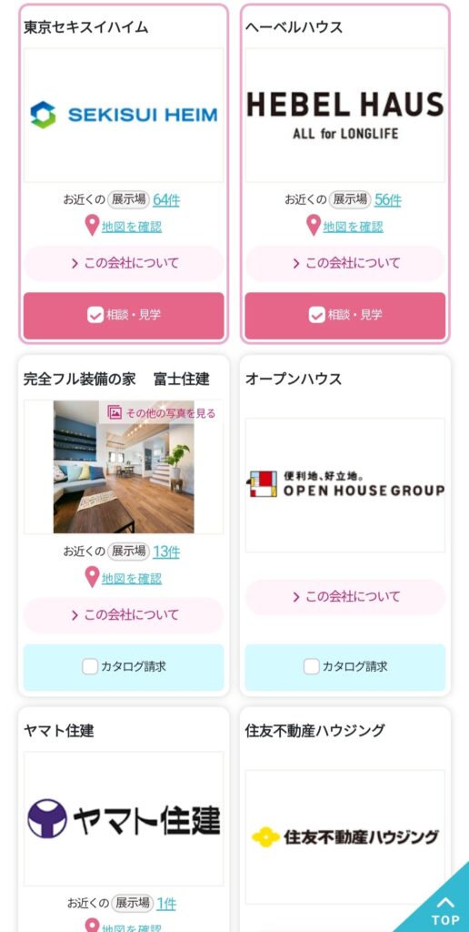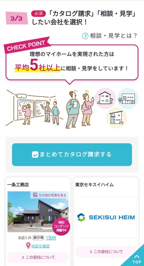 「カタログ請求」「相談・見学」のどちらかしかできないメーカーと、両方とも選択できるメーカーがあります。カタログ請求できるメーカー数に上限はありません。