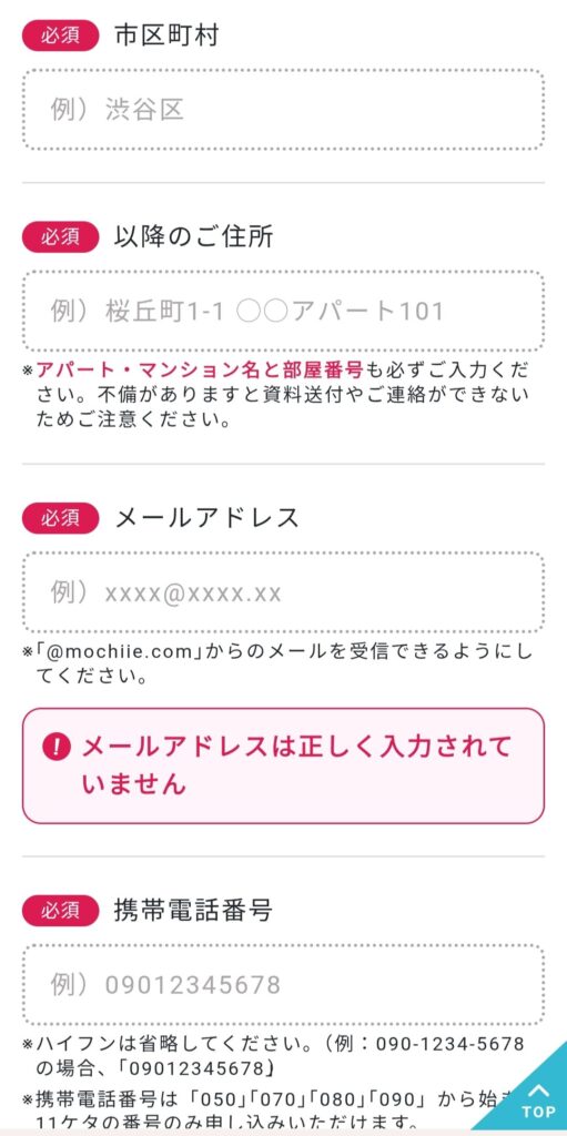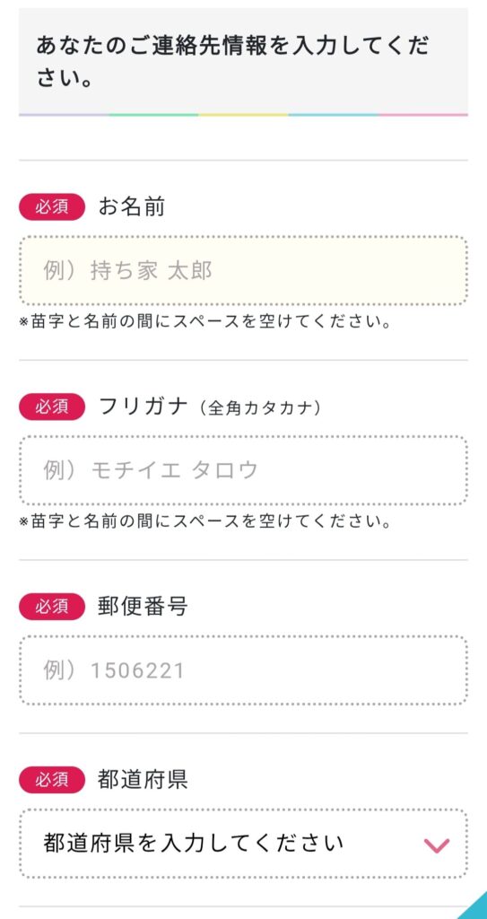 「名前」「住所」「メールアドレス」「電話番号」などの連絡先を入力していきます。