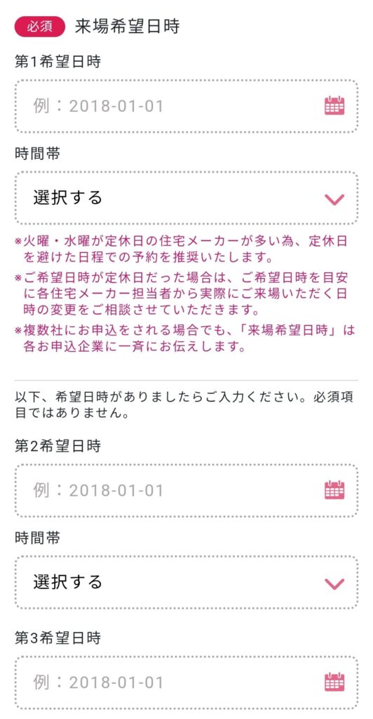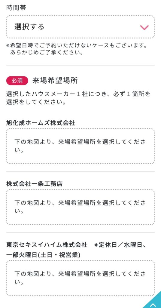 「相談・見学」を希望するメーカーがある場合は、「来場希望日時」や「来場希望場所」を入力しましょう。