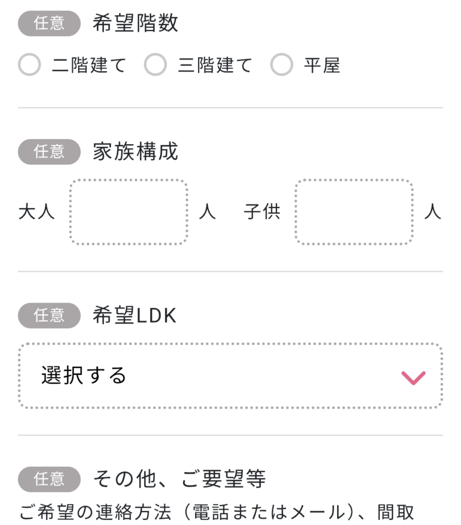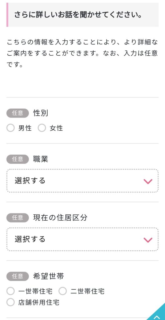 「性別」「職業」「希望階数」「家族構成」「希望LDK」などの任意項目を入力しておくと、より希望に近い提案を受けやすくなります。