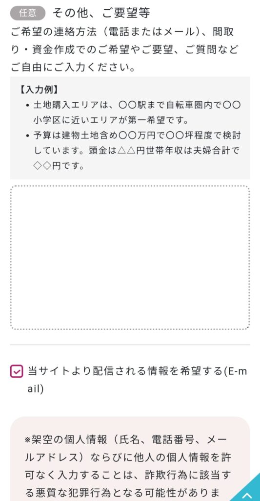 自由記述欄に「連絡方法」や「家づくりの理想条件」などを入力することができます。