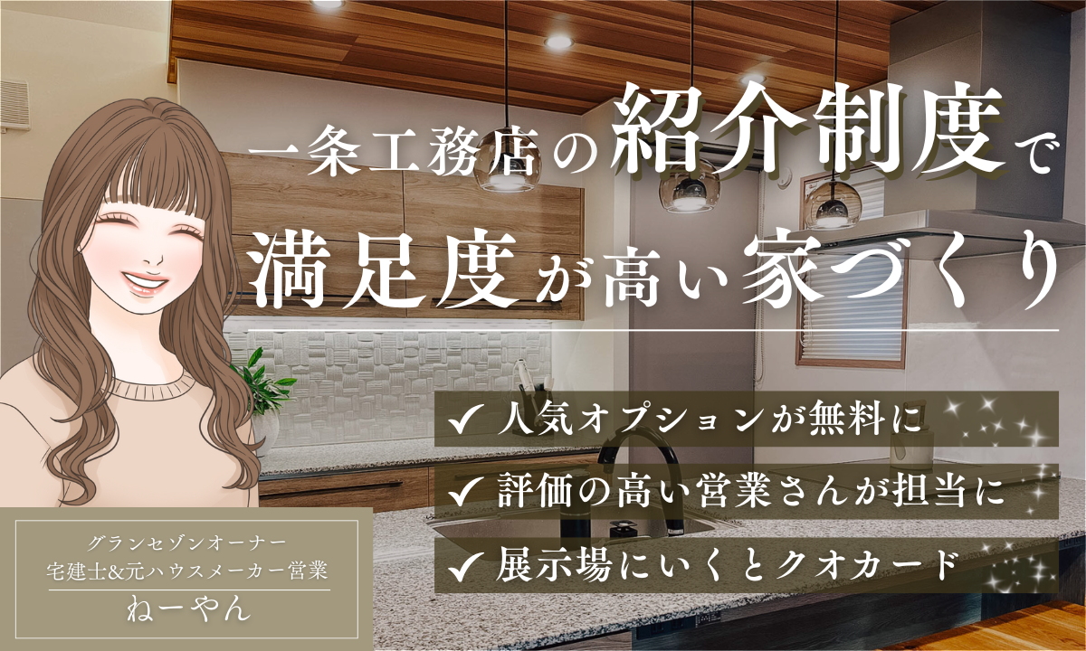 私も一条工務店のオーナーなので、当ブログを通じて、一条工務店の紹介制度を利用していただくことも可能です。全国どこにお住まいの方でもOK!インターネット経由の紹介も、一条工務店公認なのでご安心ください。
