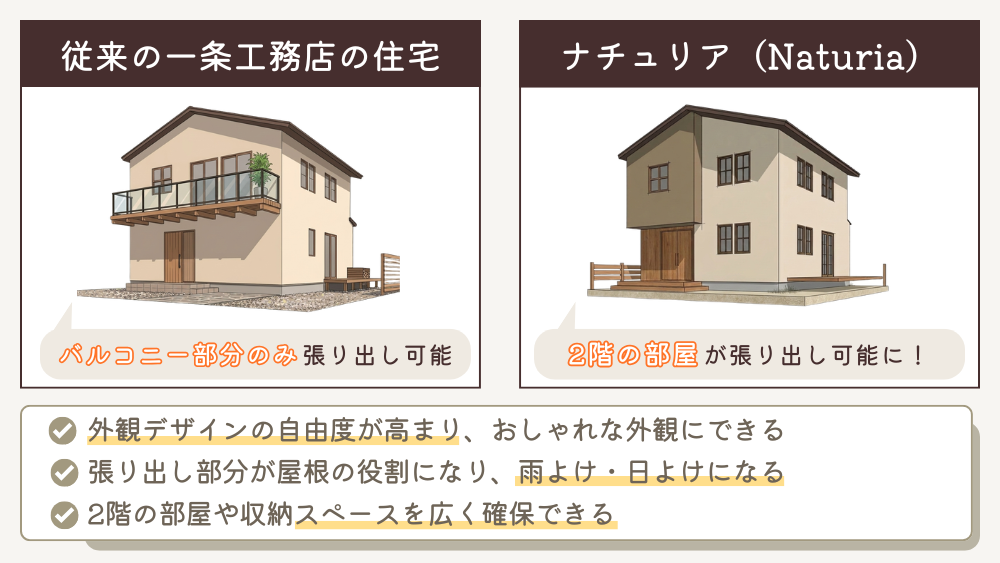 これまでの一条工務店の住宅では、2階で前に張り出せるのは主にバルコニーに限られていました。しかし、ナチュリアでは2階の部屋自体を張り出す設計ができるようになっています。